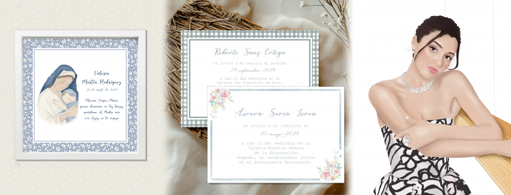 Ofrecemos la opción de realizar la ilustración del protagonista del evento para crear una invitación completamente personalizada. Esto nos permitirá usarla para la papelería del día especial como podría ser el cartel de bienvenida o los recordatorios.
