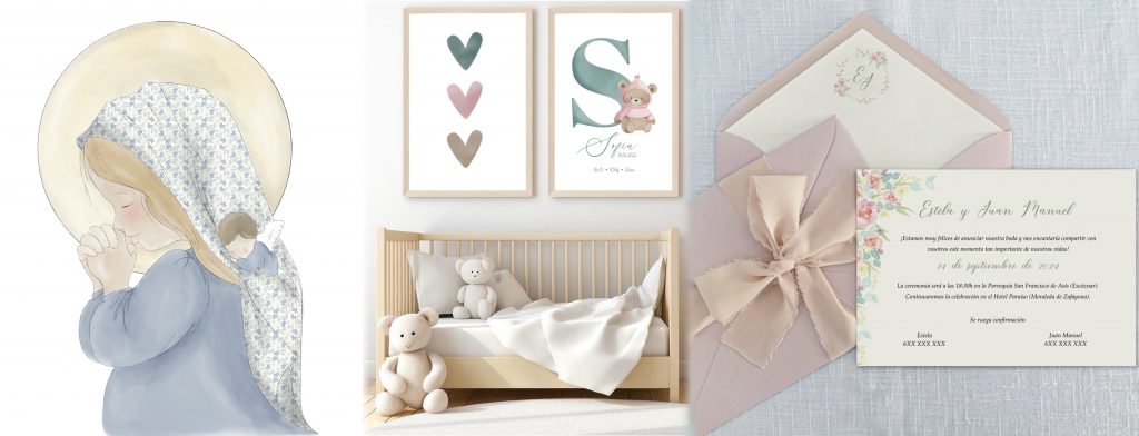 Cada una de nuestras invitaciones de boda está cuidada al detalle y creada con todo nuestro amor. Además de la papelería nupcial y las ilustraciones personalizadas realizamos invitaciones de bautizo y comunión, recordatorios, láminas infantiles y otros detalles para bebés con los que tener un detalle precioso con las personas más importantes de nuestra vida.