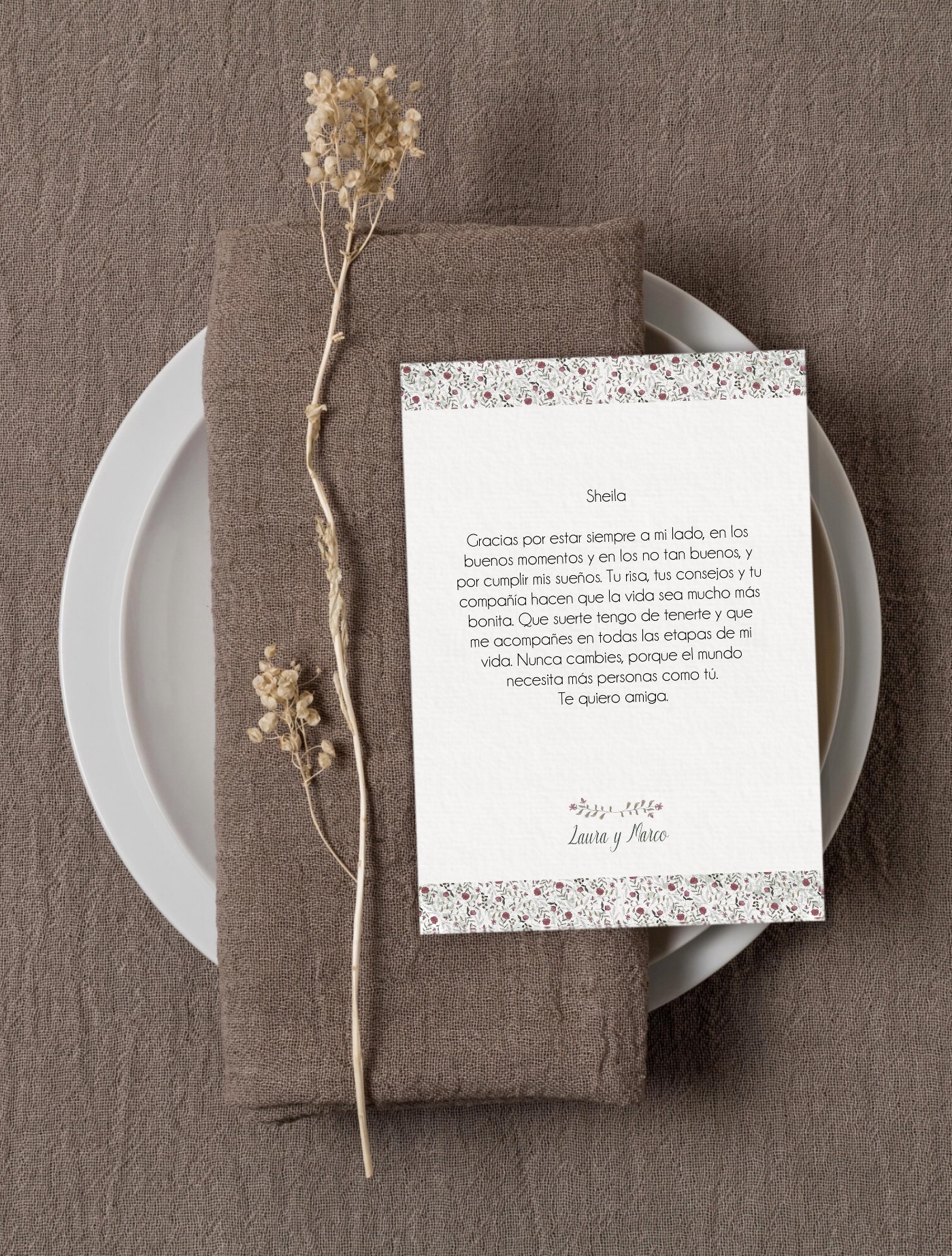 Puedes elegir tu dedicatoria sin texto y escribirla a mano o dadnos la dedicatoria de cada invitado y nosotros escribimos el texto en la tipografía de vuestra invitación.