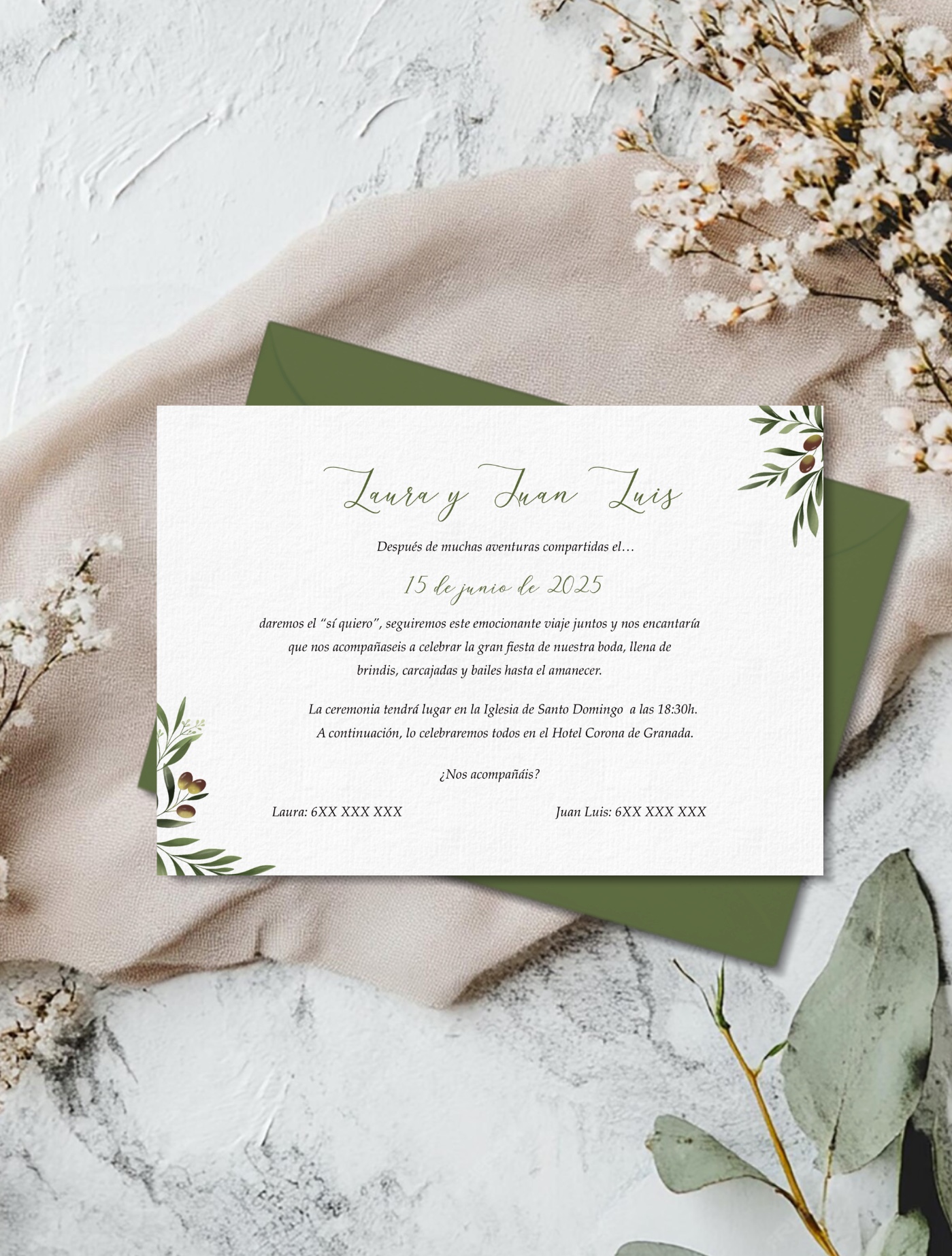 SOBRE NO INCLUIDO. Puedes elegir el sobre para completar la invitación en la sección SOBRES donde podrás encontrar una gran variedad de estilos: artesanales, clásicos, forrados…