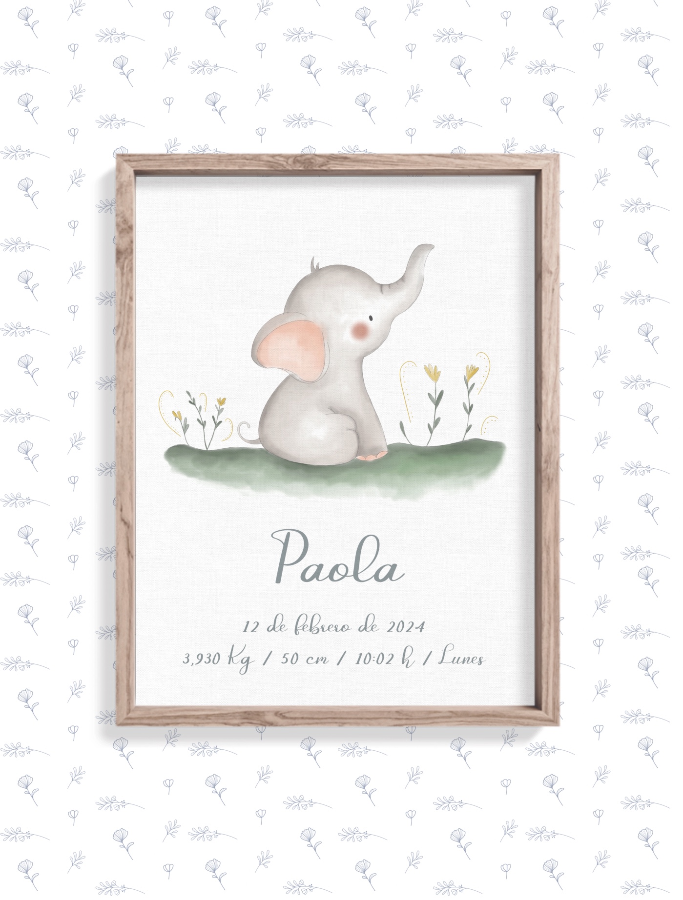 Puedes personalizar esta lámina con todos los detalles del recién nacido que se incluyen en el formulario. Si hay algún dato que desconoces, puedes dejarlo en blanco y nosotros adaptaremos el diseño.