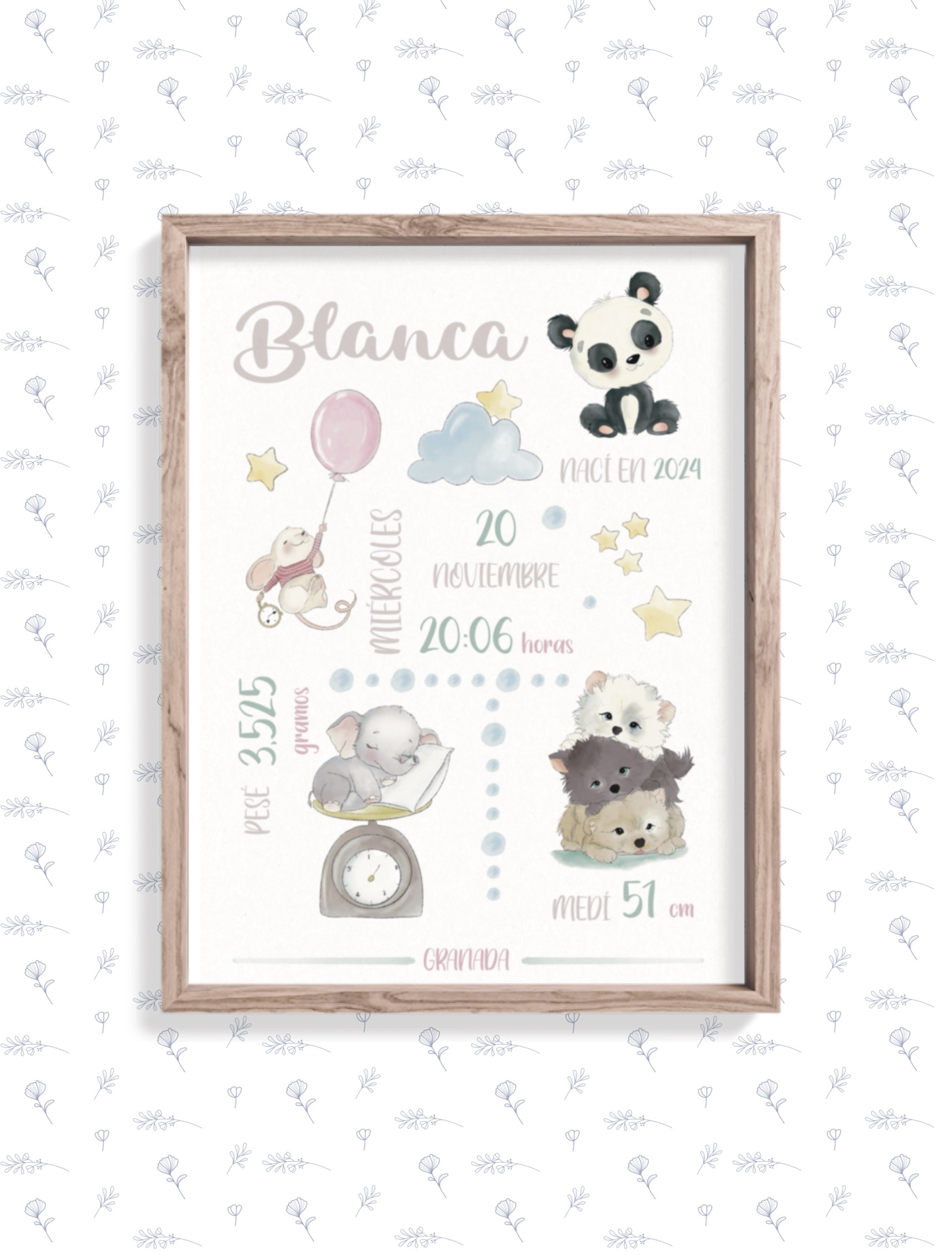 Puedes personalizar esta lámina con todos los detalles del recién nacido que se incluyen en el formulario. Si hay algún dato que desconoces, puedes dejarlo en blanco y nosotros adaptaremos el diseño.