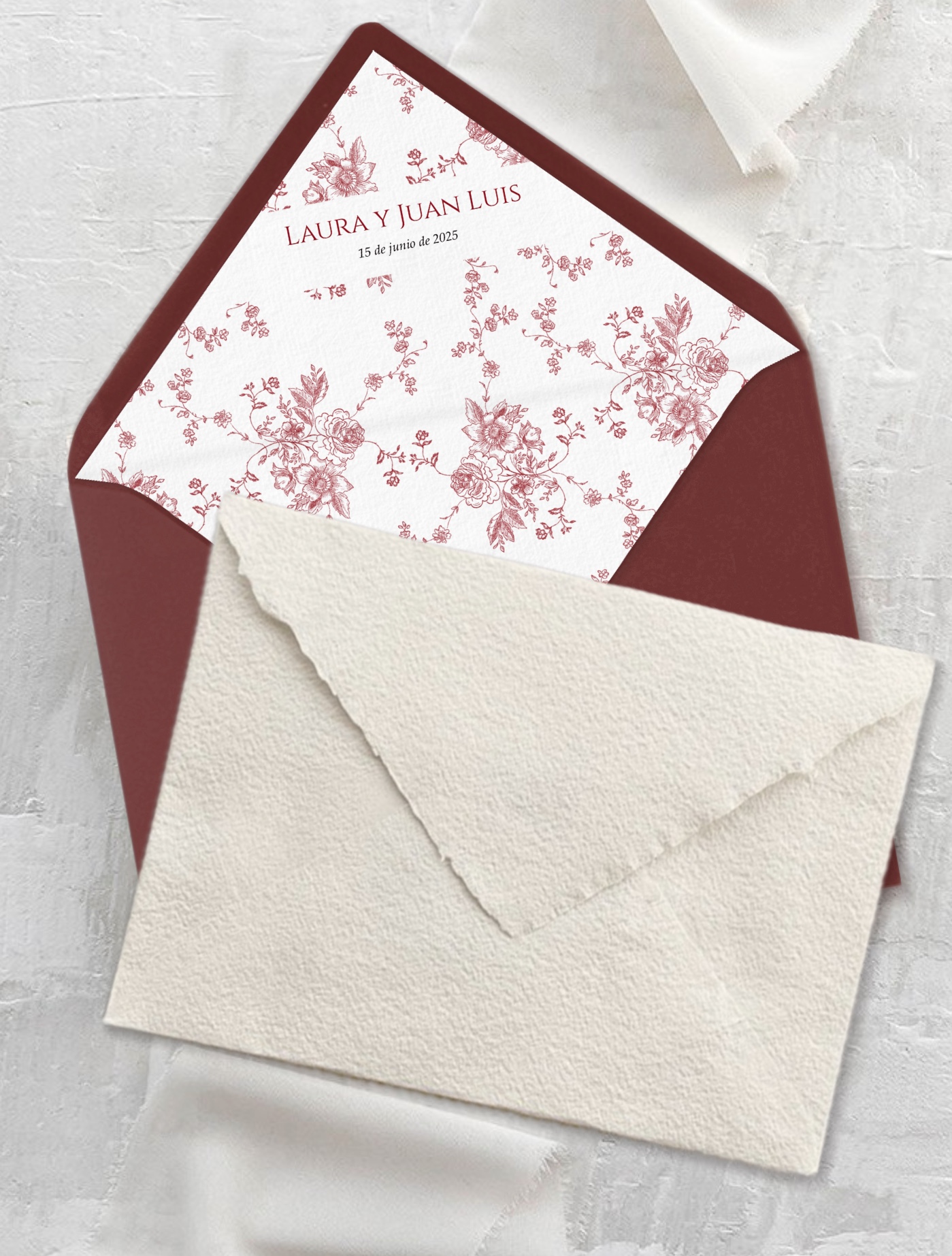 Los sobres forrados son una opción elegante para hacer que tu invitación sea única. El forro es un complemento que hace especial el sobre de tu invitación. Cuéntanos tu idea, puede ser un forro con el estilo de la invitación o con una ilustración de algún lugar importante para vosotros.