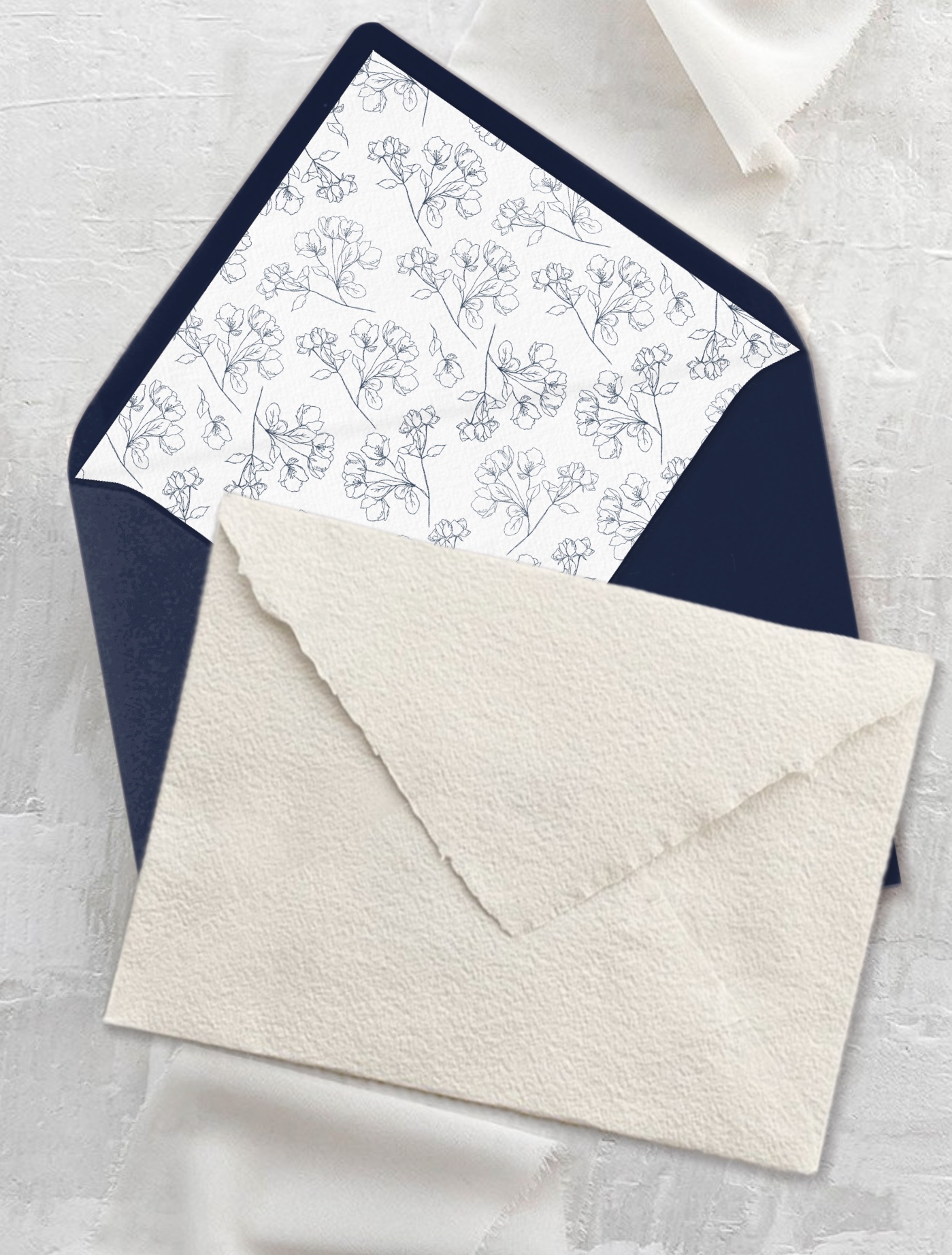 Los sobres forrados son una opción elegante para hacer que tu invitación sea única. El forro es un complemento que hace especial el sobre de tu invitación. Cuéntanos tu idea, puede ser un forro con el estilo de la invitación o con una ilustración de algún lugar importante para vosotros.