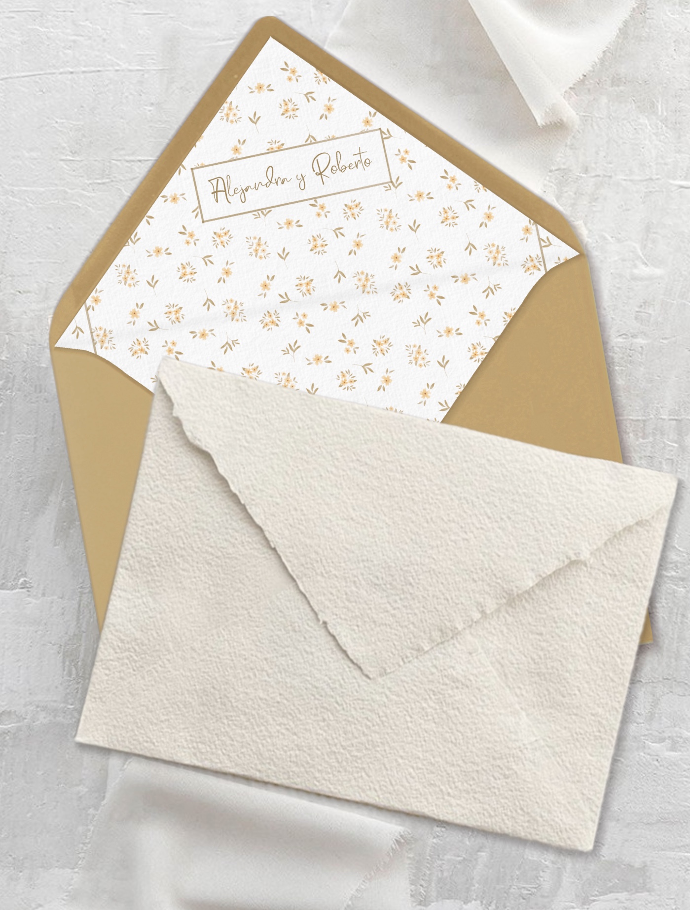 Los sobres forrados son una opción elegante para hacer que tu invitación sea única. El forro es un complemento que hace especial el sobre de tu invitación. Cuéntanos tu idea, puede ser un forro con el estilo de la invitación o con una ilustración de algún lugar importante para vosotros.