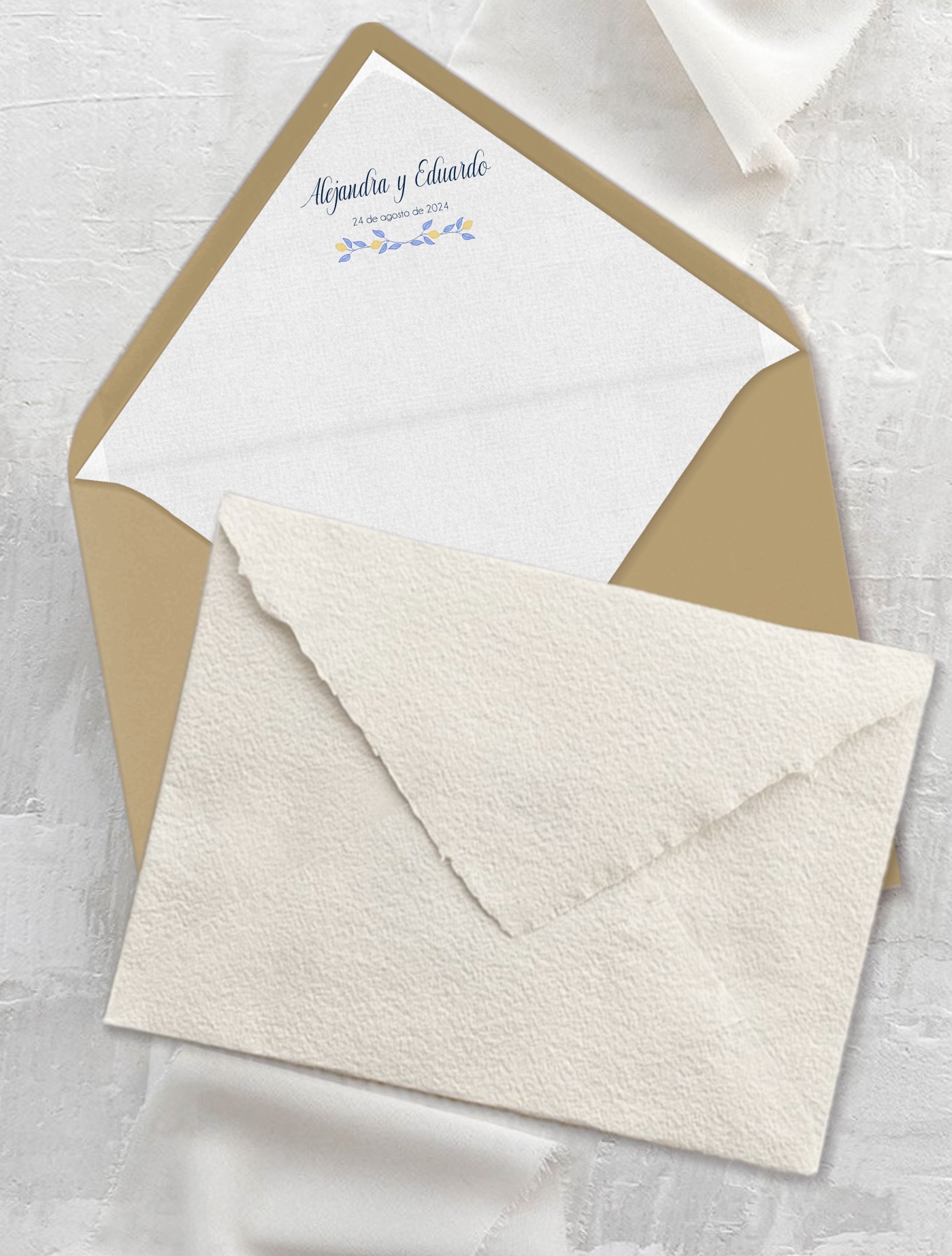 Los sobres forrados son una opción elegante para hacer que tu invitación sea única. El forro es un complemento que hace especial el sobre de tu invitación. Cuéntanos tu idea, puede ser un forro con el estilo de la invitación o con una ilustración de algún lugar importante para vosotros.